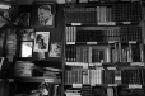 墙上还是挂着诗人惠特曼的照片,高处书丛里有尊幽默的白色雕像,那个可怜的男人似乎被这么多书挤扁了脑袋……